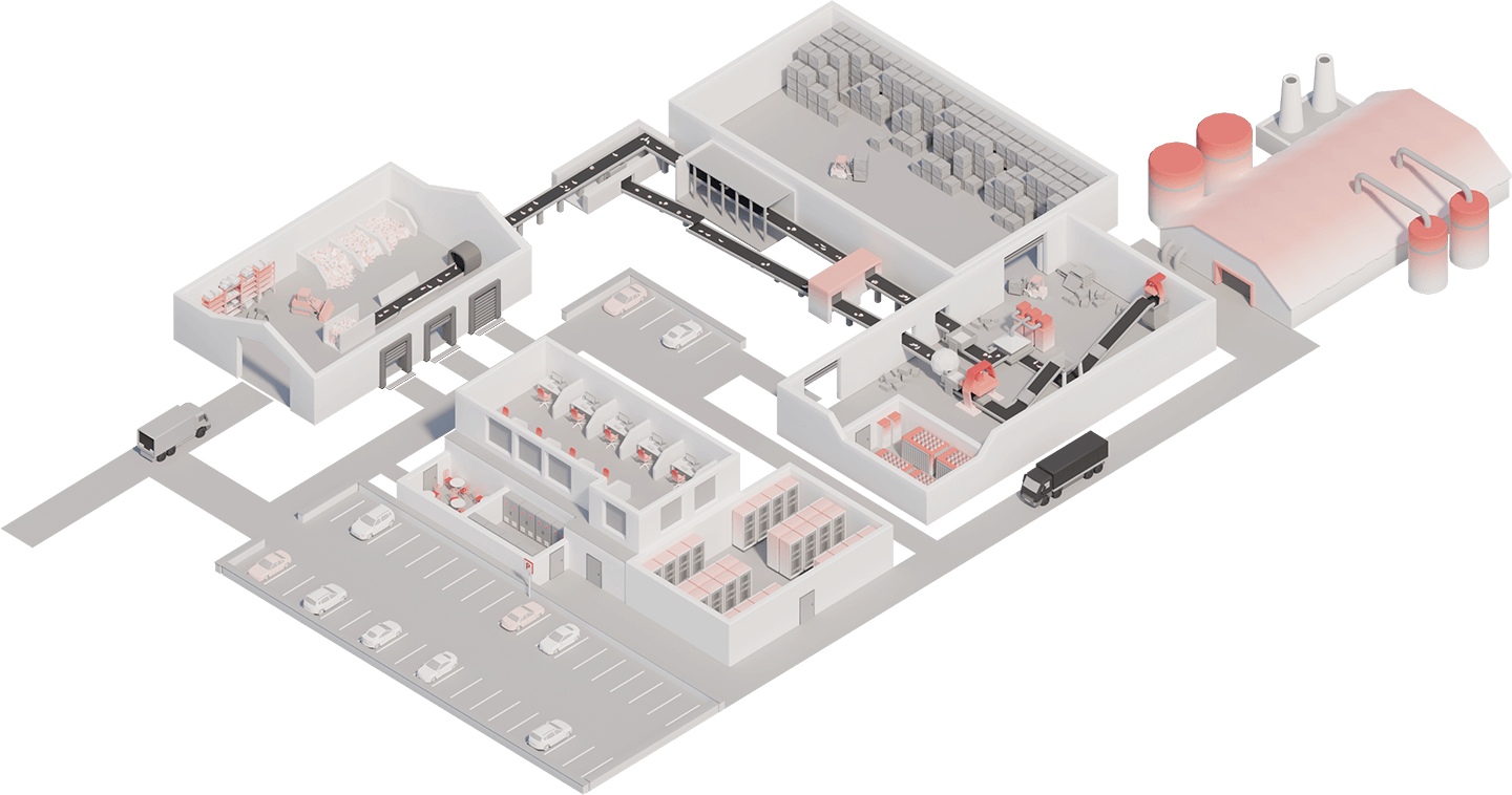 Manual sorting areas are enclosed work cabins in which recyclables and material fractions are inspected and separated by hand. The materials are transported on conveyor belts, with workstations positioned on both sides along the conveying path. Lighting, ventilation and air-conditioning systems ensure ergonomic working conditions, but at the same time increase electrical and thermal loads in these areas. Due to continuous conveyor operation and the accumulation of materials, an elevated fire risk is present.